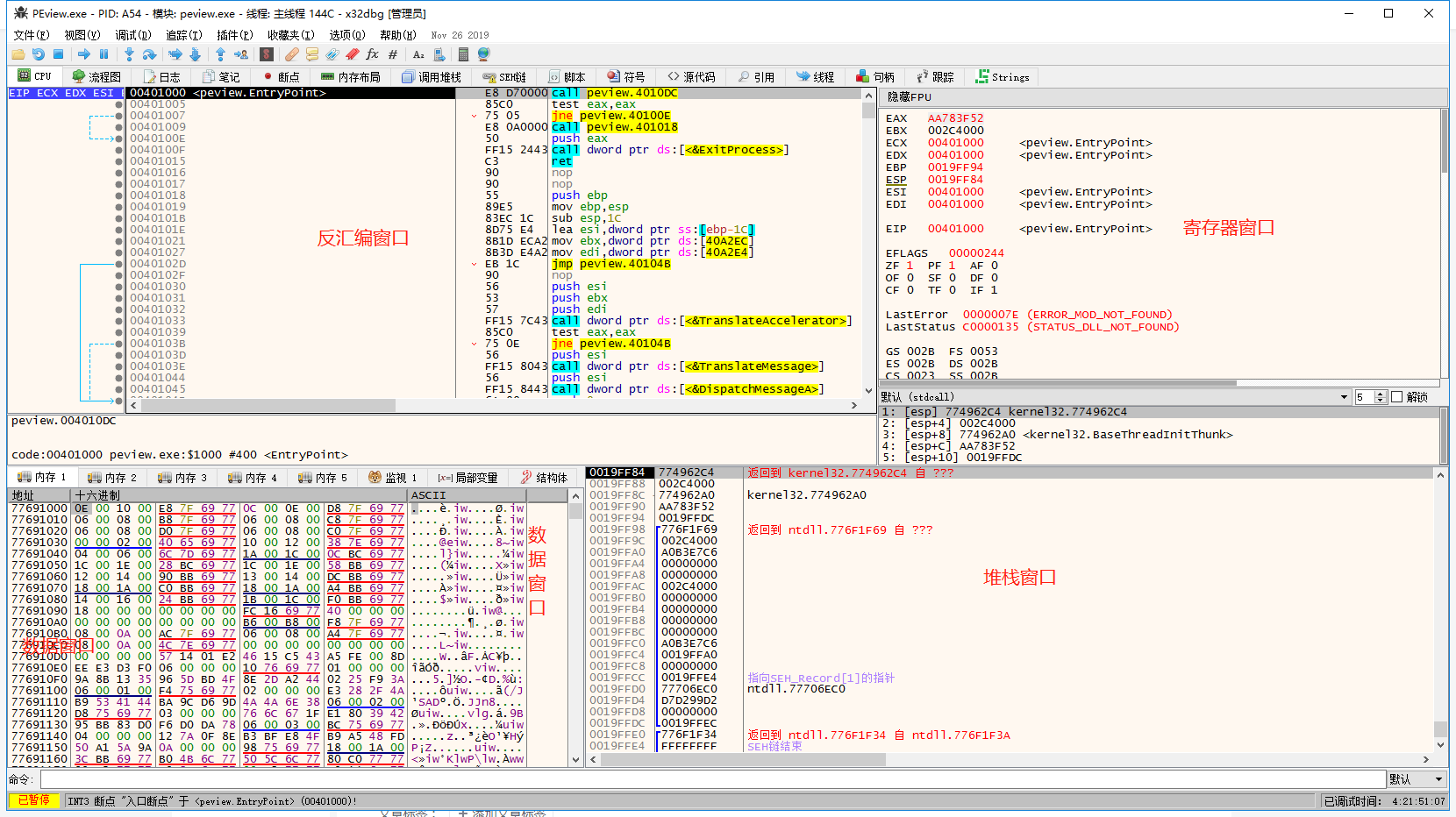 这个位置显示的是需要分析的程序的反汇编代码。在第一个区域的最左侧例如“7712EAA3”这一列就是内存地址区域,接着“E8 07”就是汇编指令的opcode,“jmp xxxxxxxxx”这个区域就是汇编代码区,最后有一个空白的地方,我们可以在这个位置输入一些注释。