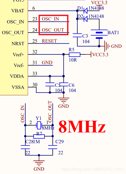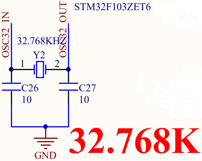 - STM32单片机主晶振引脚上外接一个晶振(STM32F103ZET6的主晶振管脚为23,24)