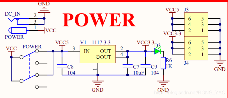 它们的网络标号都是 VCC,经过电源开关出来后是 VCC5,经过 3.3V 稳压芯 片转换为 3.3V 供系统及外围电路使用。所以使用任何一个接口供电均可