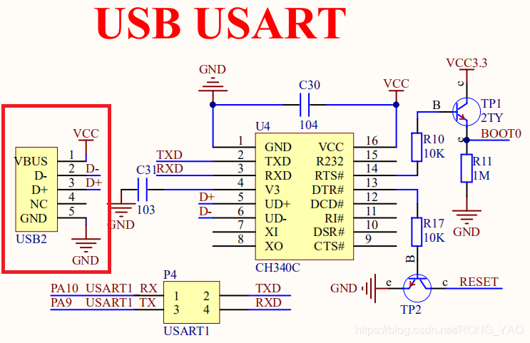 CH340芯片的串口TXD和RXD管脚连接到STM32的串口1(PA9,PA10)