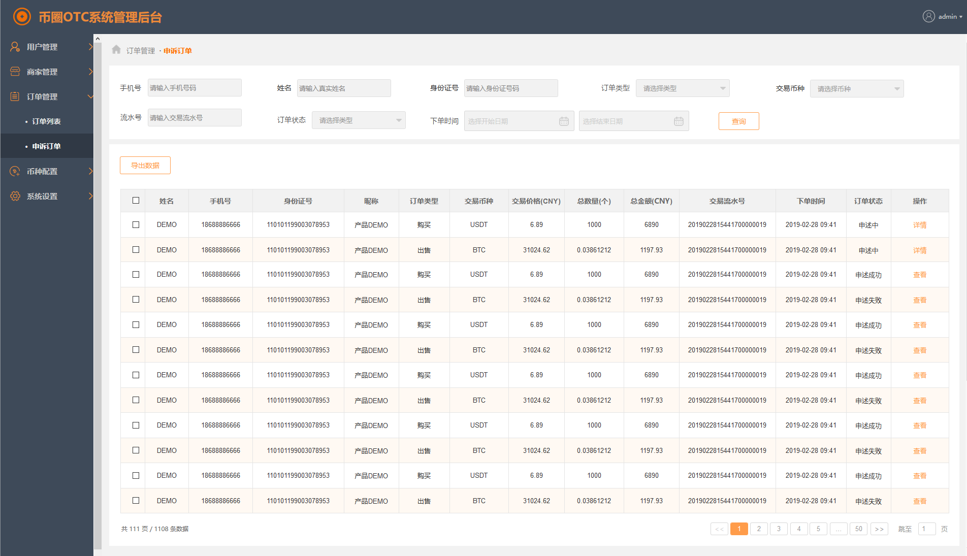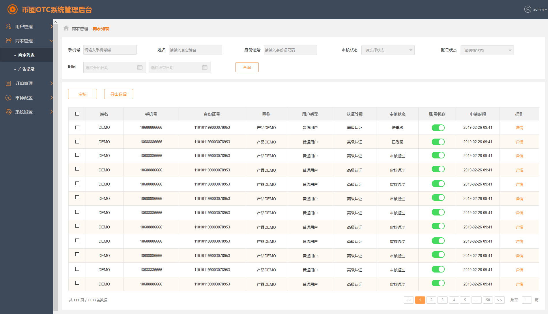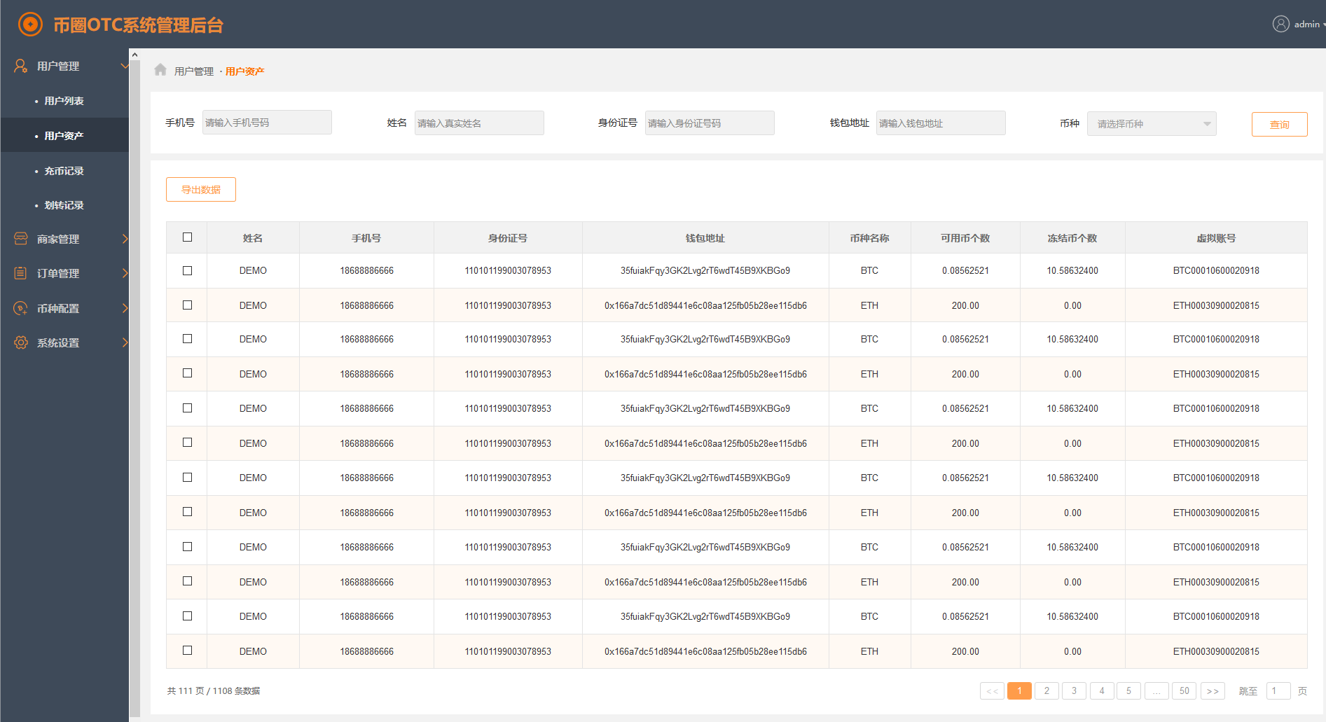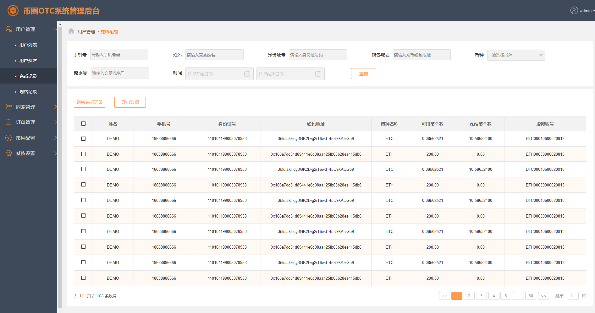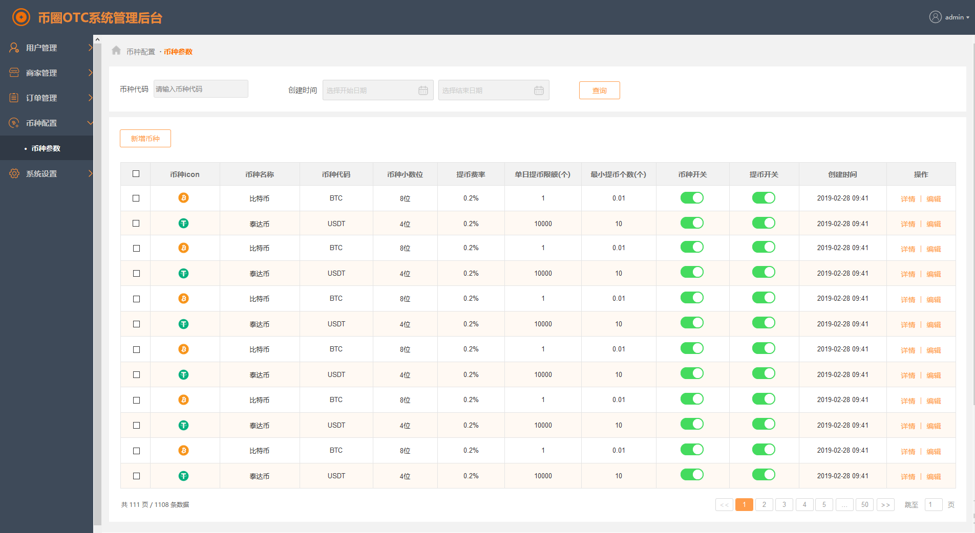 区块链项目/比特币/币圈管理后台/OTC系统管理后台/虚拟数字货币OTC场外交易平台/交易币种管理/币种配置/用户资产/充币记录/划账记录/币种参数/商家管理/rp原型/Axure后台管理原型/币圈OTC系统管理后台