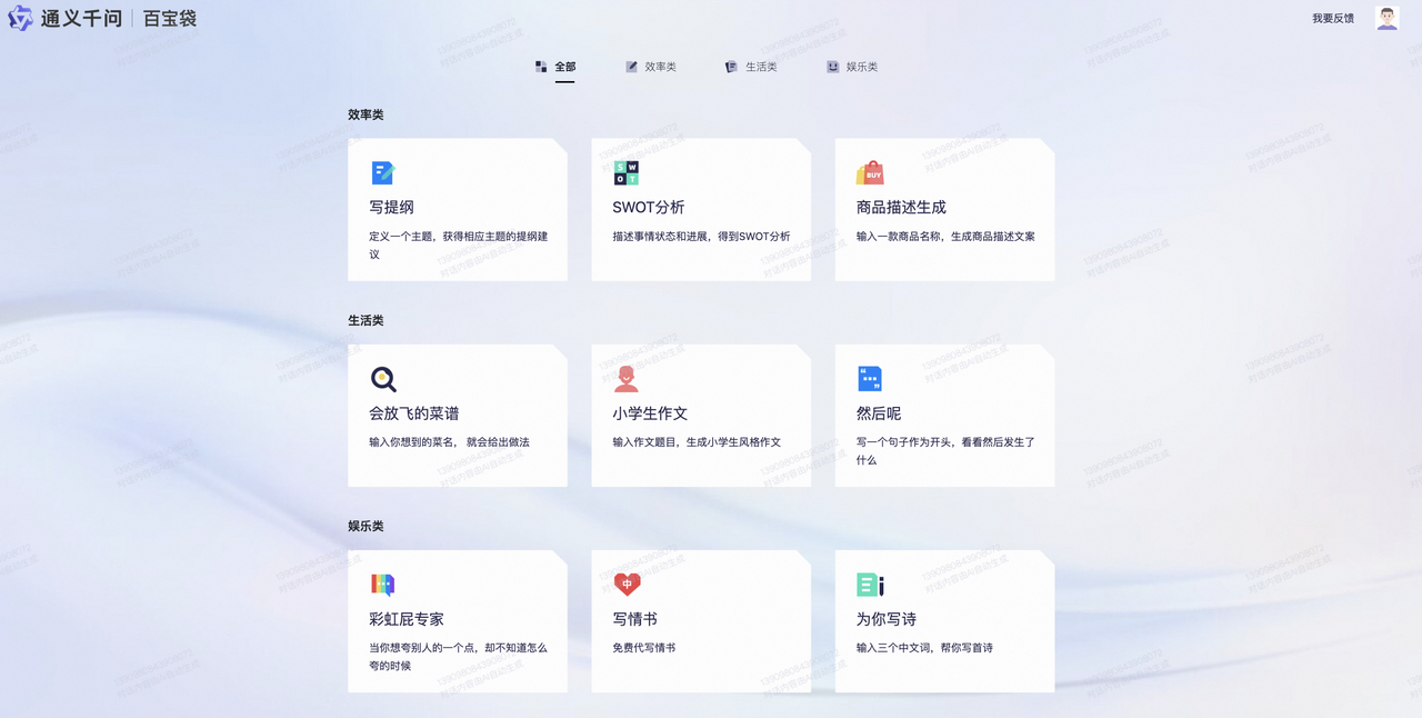 - 通义千问功能包含效率类,生活类与娱乐类三部分,其中效率类包括自定义主题生成提纲,SWOT分析和根据商品名称生成商品描述文案等功能;生活类如根据菜名生成菜谱,根据作文题目生成小学生风格的作文以及根据首句生成下文等;娱乐类如生成彩虹屁文案,写情书以及根据三个中文关键词写诗等。