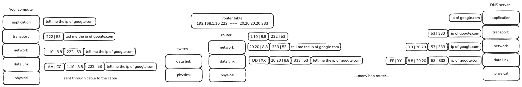 53, so it knows it is a DNS request. And it resolve the ip ofgoogle.comand return the ip. - And the return process is similar to the request process. Finally, after those, your computer will receive the ip of