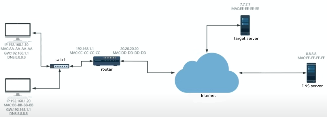 192.168.1.10and the destination ip is the DNS server’s ip8.8.8.8. But the DNS ip you cannot find locally, so you need to send the DNS request to the gateway you connect. And because the communication via MAC address in the same network, so it will be processed in data link layer. - In data link layer, the source MAC address