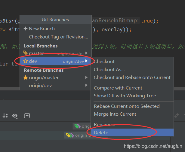 点击Android Studio顶部菜单栏上的VCS–>Git–>Branches…,打开Git Branches窗口,选中本地dev分支,选择Delete即可。如图: