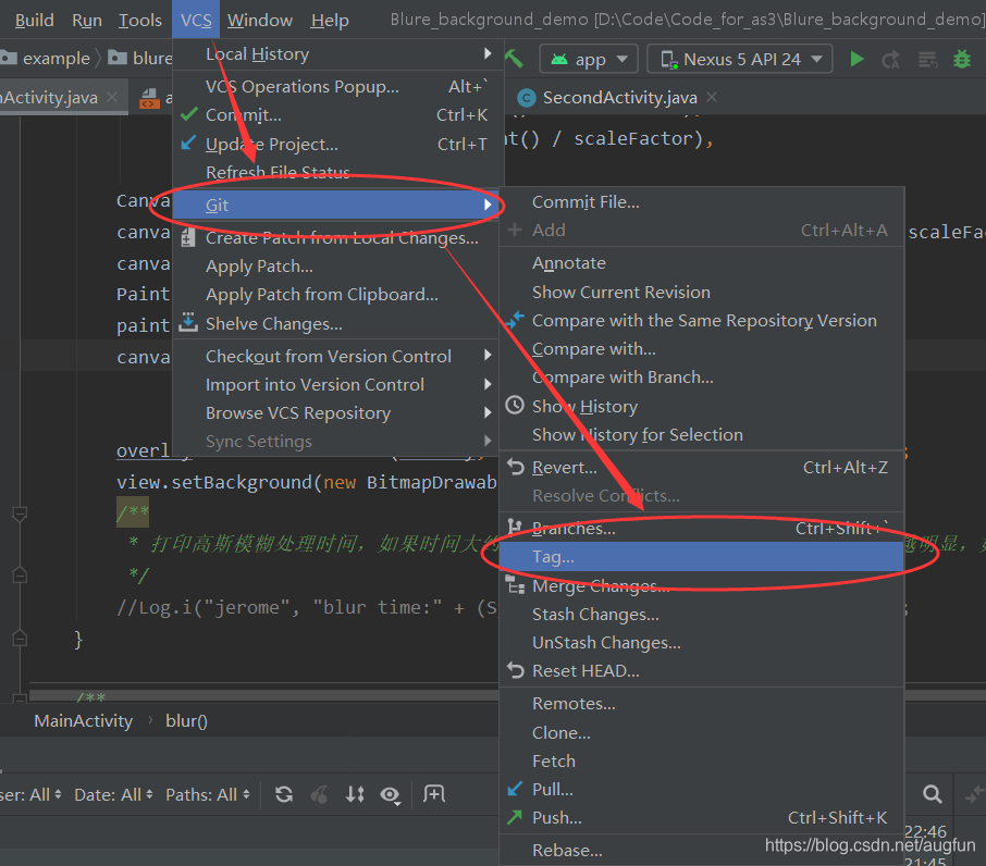 点击Android Studio顶部菜单栏上的VCS–>Git–>Tag…,如图: