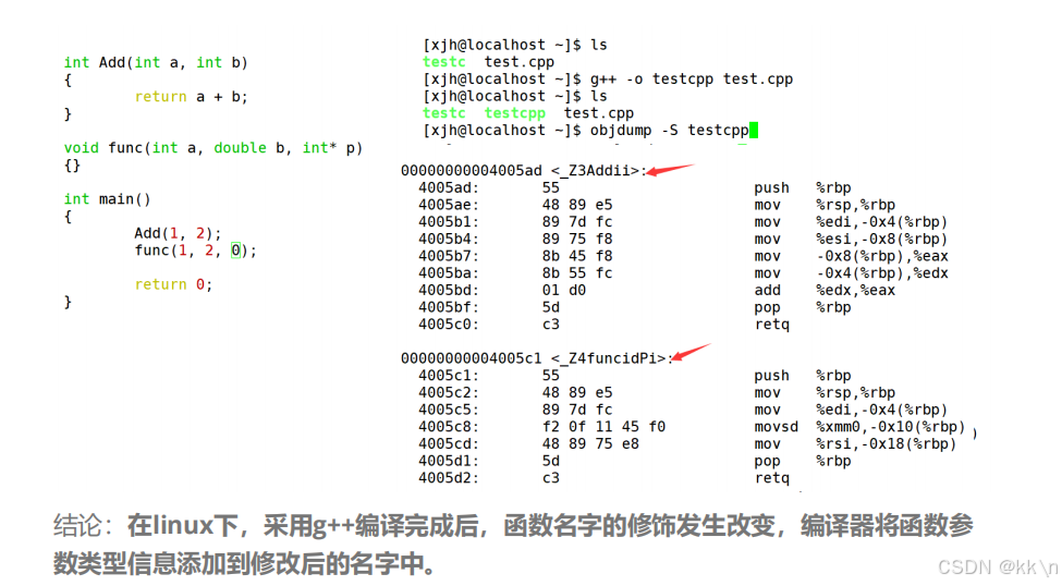- 通过截图我们可以看出gcc的函数修饰后名字不变。而g++的函数修饰后变成【_Z+函数长度+函数名+类型首字母】。结论:在linux下,采用gcc编译完成后,函数名字的修饰没有发生改变。在linux下,采用g++编译完成后,函数名字的修饰发生改变,编译器将函数参数类型信息添加到修改后的名字中。