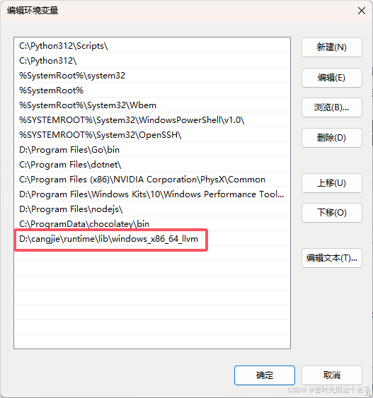这样要配置环境变量,在 PATH 中加上 D:\cangjie\runtime\lib\windows_x86_64_llvm