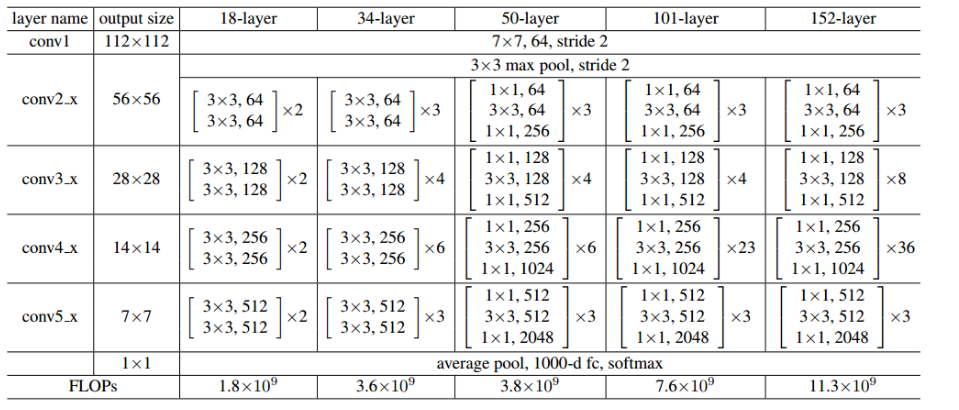 ResNet就是使用这样的Bottleneck层层堆叠形成了最后的网络,根据层数的多少有ResNet18,ResNet34,ResNet50等结构。具体的网络结构参数如下图: