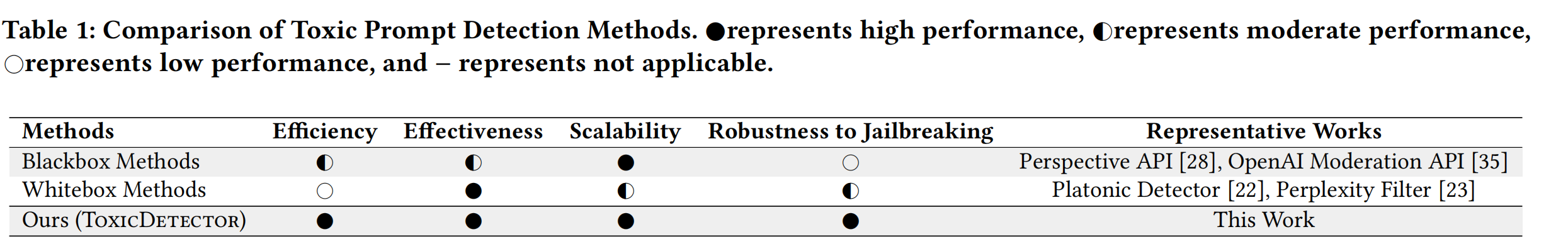 用于检测有毒提示的现有技术分为黑盒和白盒两大类,每一类都面临特定挑战。黑盒技术(例如 Google Jigsaw 的 Perspective API 和 OpenAI 的 Moderation API)依赖于捕捉提示中的有毒内容。然而,有毒提示表现出广泛多样的行为,包括不同的概念类别和多样的表达方式,并且可以利用越狱技术进行伪装。这使得黑盒技术难以有效捕捉广泛的有毒内容。另一方面,像 PlatonicDetector 和 PerplexityFilter 这样的白盒方法,通过利用模型的内部状态来深入了解模型行为,可以在一定程度上有效缓解越狱技术的影响,并减少有毒提示的多样性所带来的影响。然而,它们巨大的计算需求使得这些方法难以扩展,无法满足需要快速且资源高效提示处理的应用程序的要求。因此,迫切需要开发一种轻量级但有效的有毒提示检测方法,以确保可扩展性和效率,使其适用于实时应用,同时克服现有方法的不足。