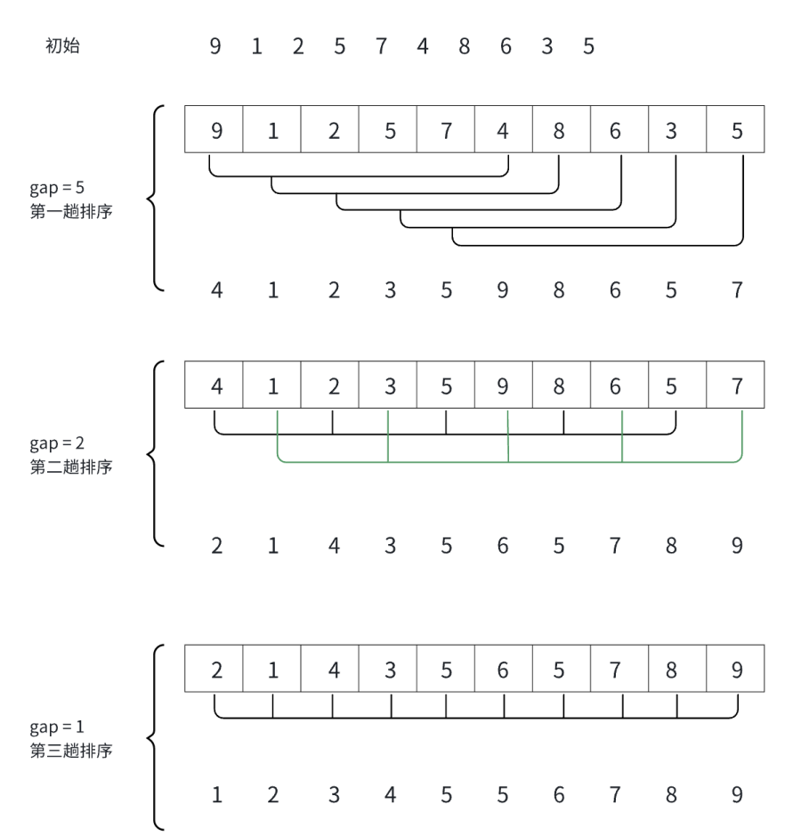 - 希尔排序的思想:选定一个gap值,把代排序的文件分成各组,间隔相等(为gap值)的数据视为一组,对每一组内的数据进行排序,排序完成后我们进行一次迭代,更新一下gap值,再次分组排序,直到最后我们就直接对整个数据集合进行直接插入排序。这个时候的数据就基本符合直接插入排序效率较高的那种情况了(就比如上文所说,大的在前小的在后)。