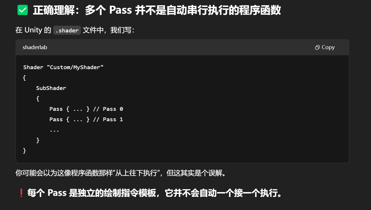✅ GPU 对这个像素相关的片元 shader 多次执行,每个 pass 是渲染管线中的独立阶段