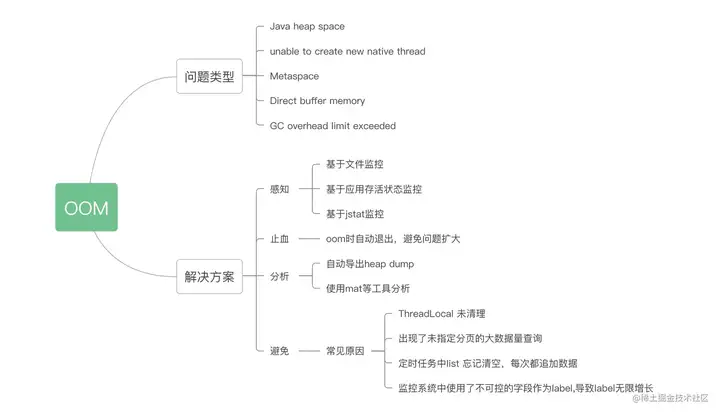 第二种情况,就需要针对性分析了,这里笔者给出常见的oom原因,大家在问题排查时,可以逐个排除,直到找到正确答案: