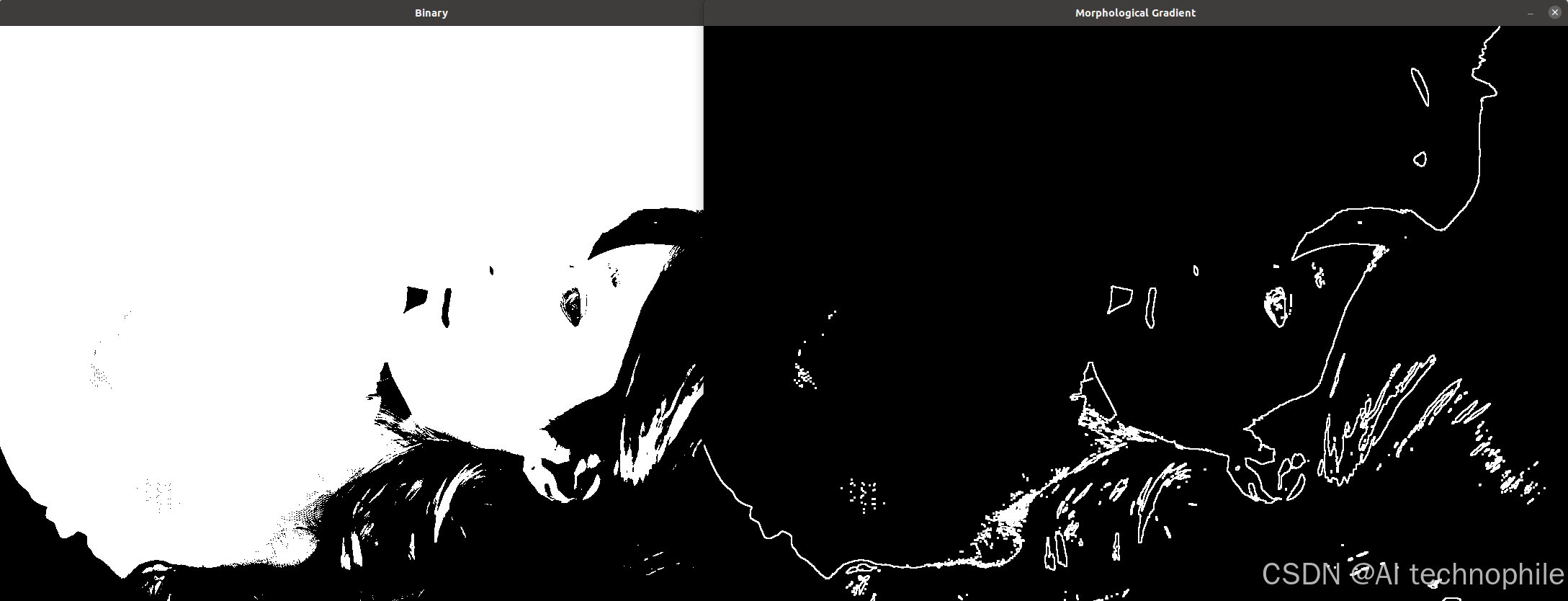 形态学梯度可以定义为:梯度 = 膨胀结果 − 腐蚀结果。得到的直观效果:只保留前景的边缘像素,其余部分变黑。