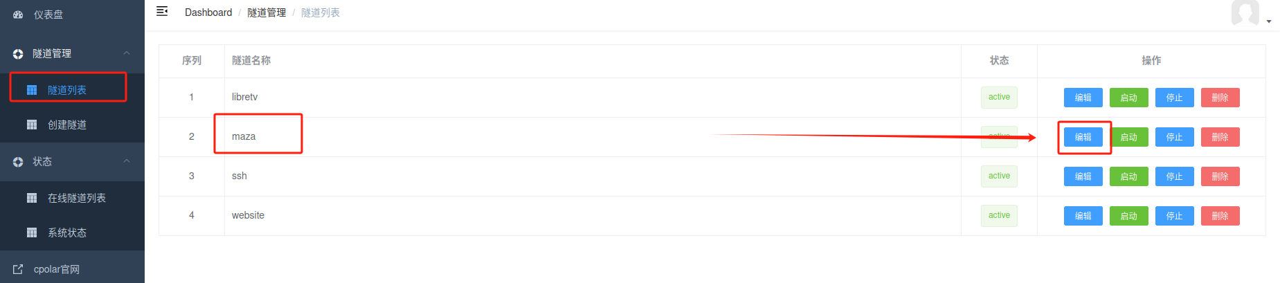 登录cpolar web UI管理界面,点击左侧仪表盘的隧道管理——隧道列表,找到所要配置的隧道maza,点击右侧的编辑。