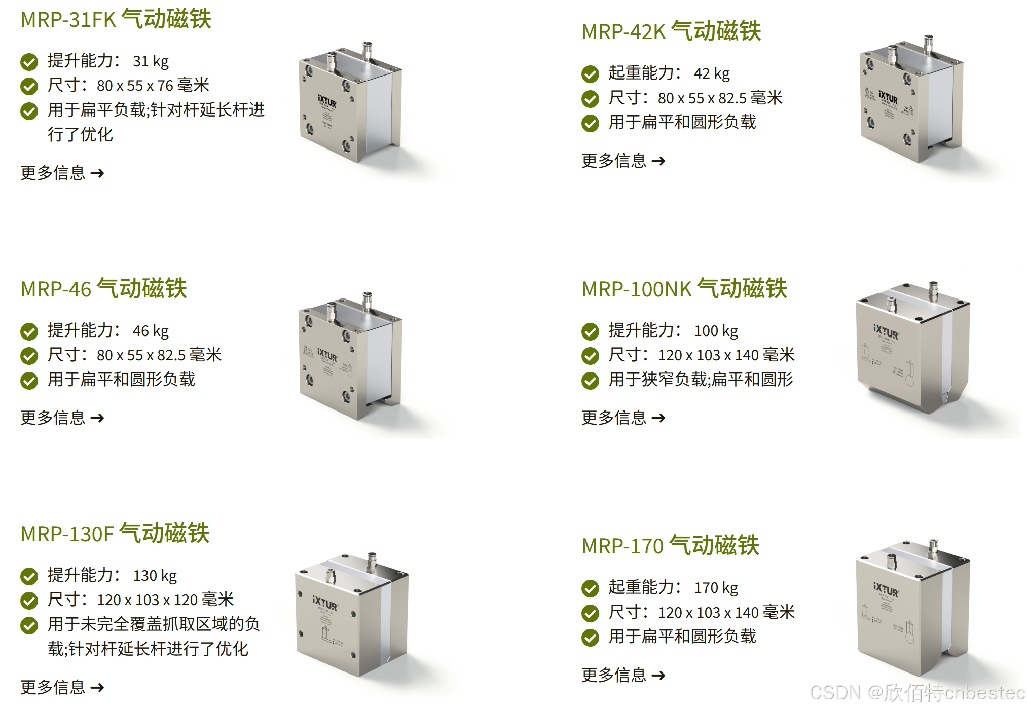IXTUR提供多种型号的气控永磁铁,满足不同工业需求,主要包括MAP系列、MRP系列和LI-120自动提升磁铁。