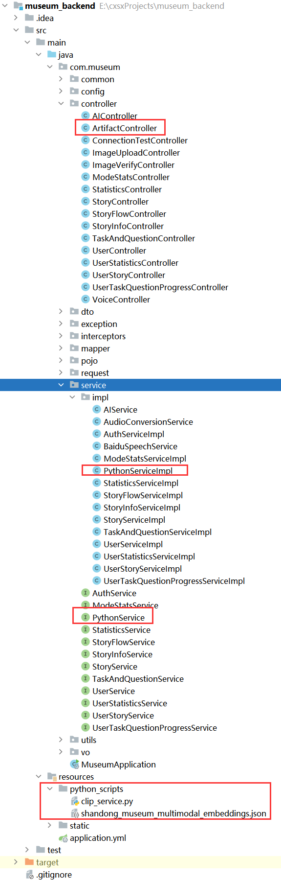 这一系列Java程序实现了一个文物图片匹配服务,通过调用Python脚本进行图像匹配。下面我将详细讲解每个组件的功能和实现细节。