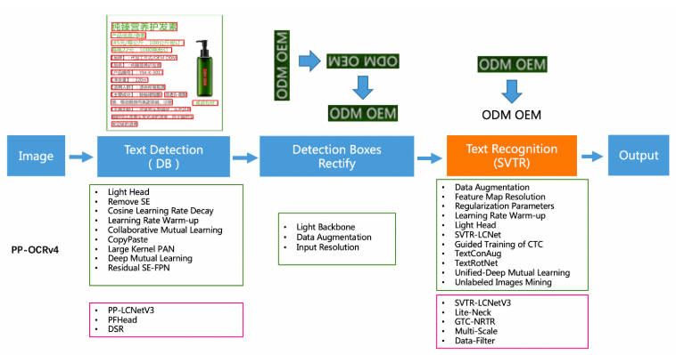 PP-OCRv4在PP-OCRv3的基础上进一步升级。整体的框架图保持了与PP-OCRv3相同的pipeline,针对检测模型和识别模型进行了数据、网络结构、训练策略等多个模块的优化。