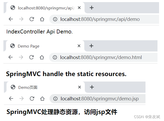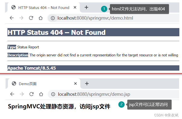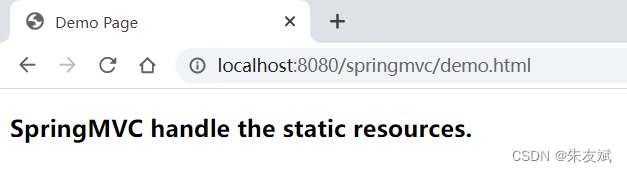 - 启动工程,依次访问两个资源文件,例如:http://localhost:8080/springmvc/demo.jsp、http ://localhost:8080/springmvc/demo.html。