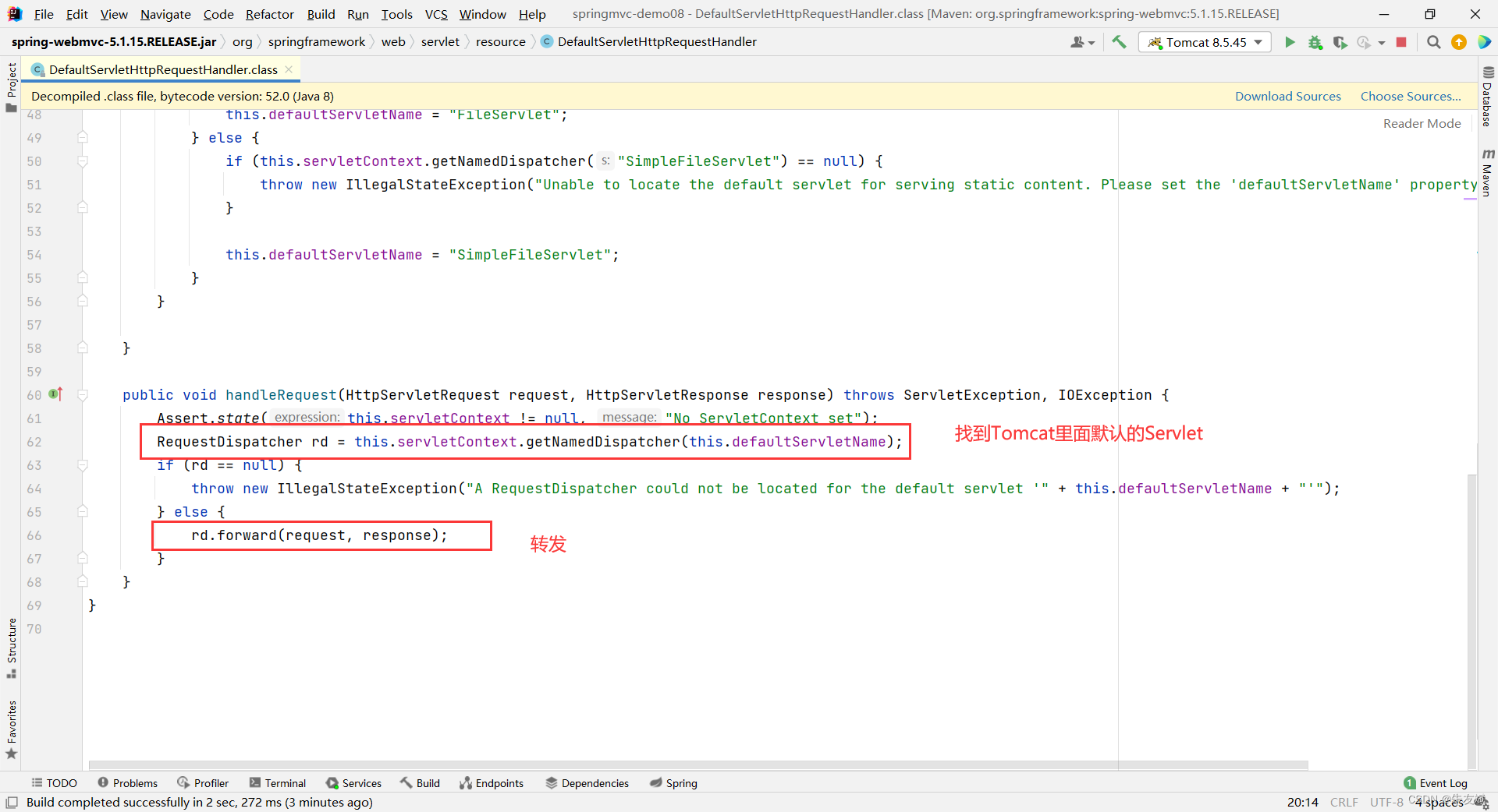 当我们添加<mvc:default-servlet-handler/>这个配置之后,SpringMVC会定义一个DefaultServletHttpRequestHandler类,接着SpringMVC通过DefaultServletHttpRequestHandler类将当前请求转发到Tomcat容器里面的DefaultServlet,这个时候就相当于是Tomcat处理静态资源了,完美解决静态资源访问问题。