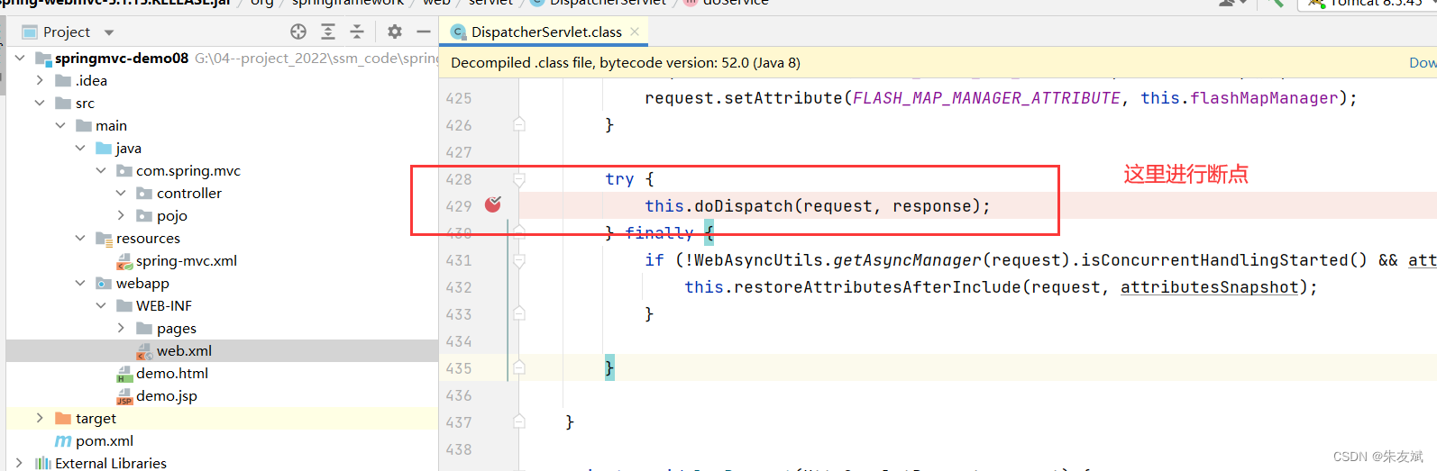 为了验证SpringMVC框架会不会处理JSP文件,那我们可以通过源码来看下,在DispatcherServlet类里面,给【doDispatch()】方法打一个断点,然后分别访问两个静态资源文件,看两次请求是否都会被断点拦截到。