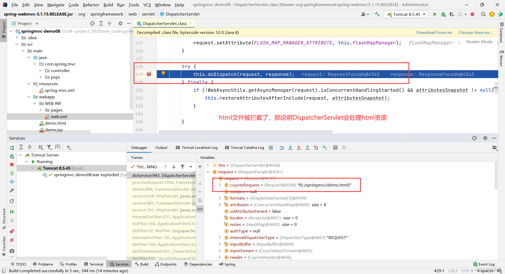 从断点可以看到,SpringMVC框架会拦截html静态资源。