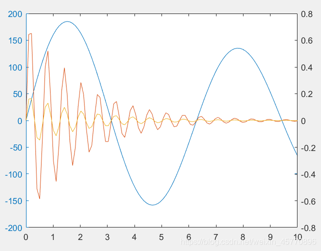 y2 = 0.8*exp(-0.5*x).*sin(10*x);