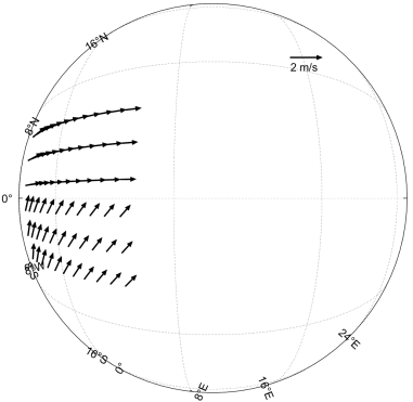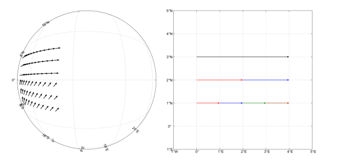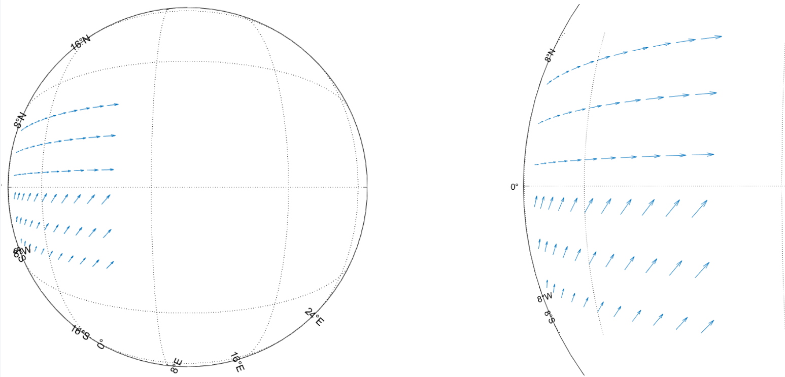 从代码中的第3、4行可以看出,这些矢量的大小都是相等的,都等于1。但由于采用了卫星(Satellite)的地图投影,不同位置放大系数不同,箭头的大小也不同。在同一纬度上,东边的箭头长度是明显长于西边的箭头长度的;而在同一经度上,靠近赤道的箭头长度也要长于更高纬地区的箭头长度。