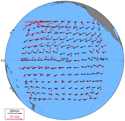 m_vec是m_map工具包中的函数,它能够在任意地图投影坐标上绘制出箭头长度与矢量大小成正比的矢量图(例2),从而能从图中直观地比较各矢量的大小。而在此时,按照需要而绘制出的箭头比例尺才能够有意义。