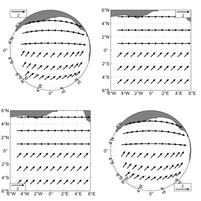 在m_map工具包中,对于m_quiver函数,为了美观,其绘制的箭头的长度含有参考地图投影各处的放缩情况而乘以了相应的放大系数的成分,因而有时并不能直接根据其长度的大小来比较不同矢量的大小(如例1)。这也是m_quiver函数所绘制的矢量场在某些时候所画的一个箭头的比例尺意义大减的重要原因。当然也可绘制由地图中心向边缘随位置到圆心的距离的增加而箭头长度递减的二维的或含有很多个箭头的比例尺集合,在这个比例尺集合中,这些箭头的长度是关于位置到圆心的距离的函数,但表现形式会有些复杂,且不易参考。
