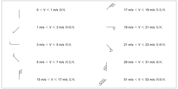 风矢杆(wind shaft)由风向杆和风羽组成。若风羽所在的位置为风向杆的顶部,则风向杆的尾端应位于该风所在的地点处,此时风向杆尾端指向的方向为风吹向的方向。而风向是指风的来向,例如风羽在风向杆的南侧,则吹的是南风。风羽可以是由短横线、长横线和三角形组成。当风速>0且≤1 m/s时,只有风杆而无风羽;当风速>1 m/s且≤3 m/s时,在风杆的靠近顶端一截的地方有一根短横线(上面留了一截杆,是为了和风速>3 m/s且≤5 m/s的情况区分),当风速>3 m/s且≤5 m/s,在风杆的顶端有一根长横线。此后每2 m/s一个档,当只有长横线时再在风杆稍靠下的位置处添加一根短横线,当有短横线时短横线变为长横线。直到风速>17 m/s且≤19 m/s时,此时有4根长横线和1根短横线,再到风速>19 m/s且≤21 m/s时五根长横线缩写为三角形。此后每五根长横线缩写为一个三角形。例如,当风速>51 m/s且≤53 m/s时,风羽为两个三角形和三根长横线(如图7所示)。