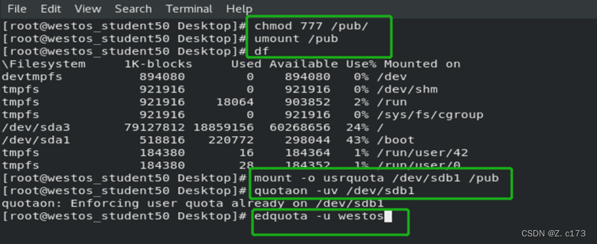 mount /dev/sda1 /pub/ -o usrquota 挂载设备并激活配额参数