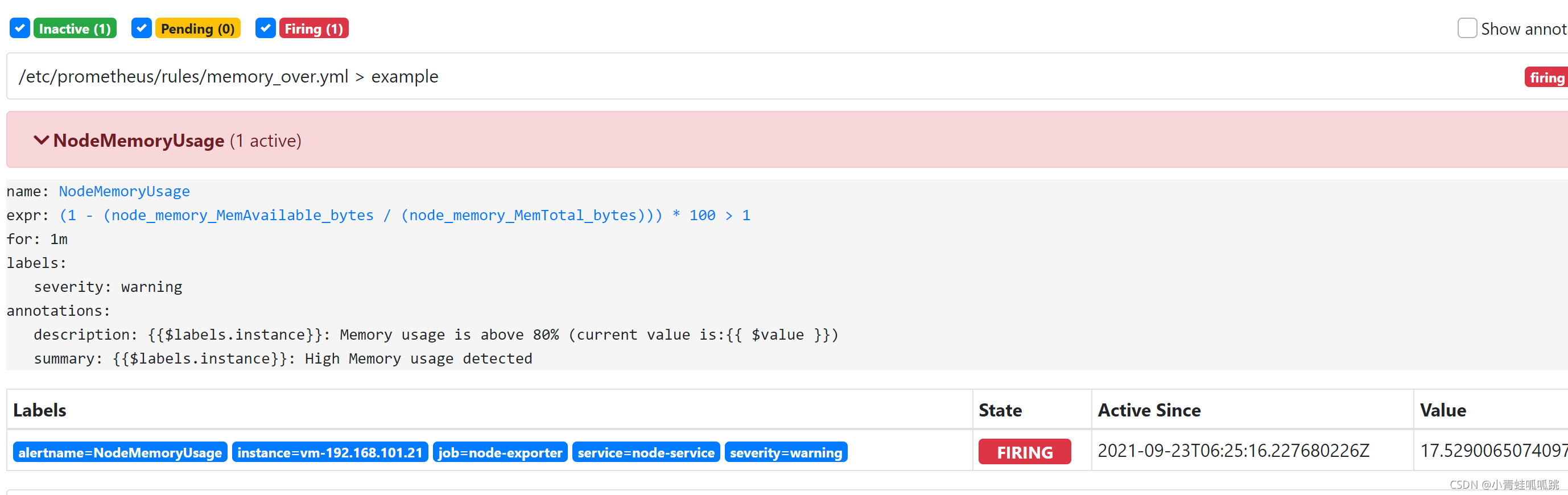 2. firing:警报已被激活,而且超出设置的持续时间。该状态下发送报警。