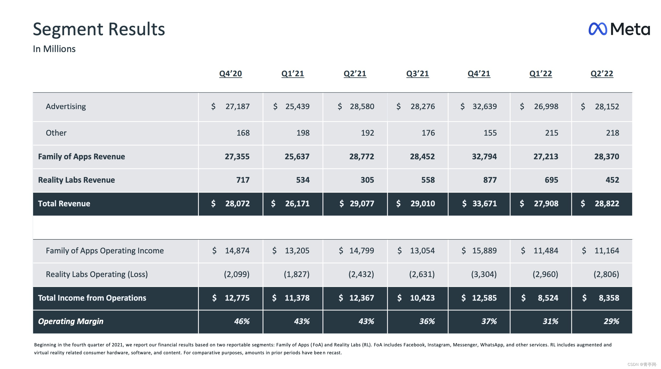 根据Meta 2022年第二季度财报显示,本季度营收288.2亿美元,同比下降1%,是公司历史上首次营收同比下滑。
