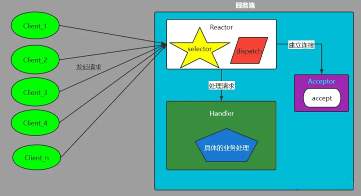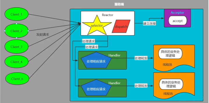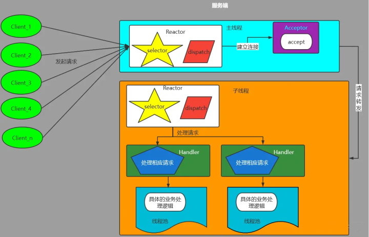 主从模式就是,Reactor 的主线程模型通过selector 进行连接事件监听,收到的如果是连接事件的话,那么用Acceptor进行连接事件处理,之后将创建好的连接事件交给Reactor子线程进行处理【Reactor主线程和Reactor子线程是一对多的关系】,此时子线程将连接加入到连接队列进行事件监听,如果发生了其他事件比如读事件,那么Reactor子线程就会调用相应的Handler进行事件处理,handler进行数据读取后复杂的业务也是交给后面的线程池进行业务处理并返回结果,Handler接收到处理结果后返回给客户端