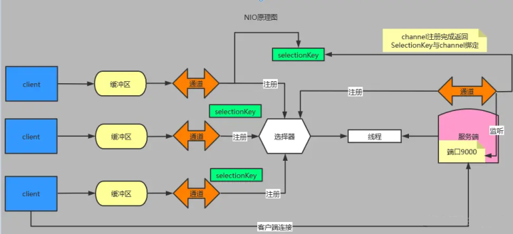 这种方式就可以通过一个线程来进行接收客户端的所有链接请求,之后监听所有的链接通道channel,如果有相应事件发生那么就进行对应的相应事件处理,比如读事件、连接请求事件等等