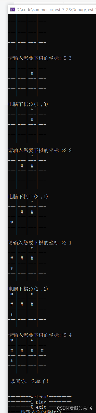 注:用随机数实现产生坐标,为了避免坐标已经下过,用循环实现。最后要记得打印出棋盘。