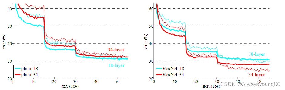 从下图可以看出,左边是没有加残差,模型越深,精度越差。而右边加了残差之后,模型越深,精度越好。