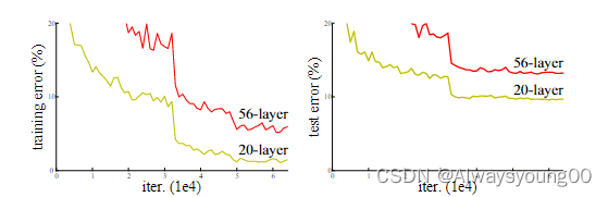 从图中我们发现,在网络层数由20层到50层,训练误差以及测试误差都变的更高了。就是说随着模型的变得复杂,精度也在下降。但是注意,这不是 overfitting,因为训练误差和测试误差都变高了,过拟合是训练误差变低,测试误差变高。