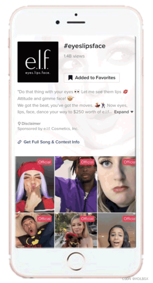 与Eyes、Lips、Face有关的品牌挑战赛一直是TikTok极具病毒性的活动。例如,ELF Cosmetics 的#eyeslipsface挑战吸引了包括Lizzo、Jessica Alba和 Ellen Degeneres等明星在内的数百万人的踊跃参与。