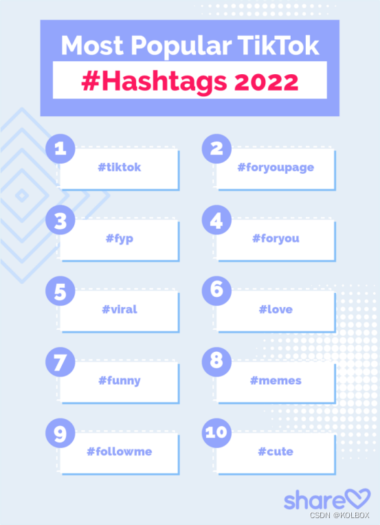 TikTok的每个视频只有150个字符用于视频说明和添加标签,井号和空格就已经占据了标签组成的三分之二,因此1 ~ 5个标签是最合适的。