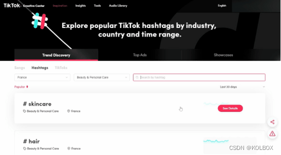 使用TikTok内部工具平台「Trend Discovery」查找热门标签。