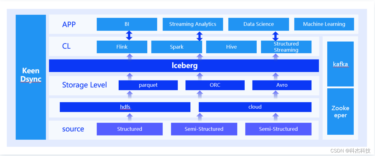 目前Spark 中 StructuredStreaming 只支持实时向Iceberg中写入数据,不支持实时从Iceberg中读取数据,科杰科技采用的方式是使用Structured Streaming从kafka中实时读取数据,再写入到Iceberg。