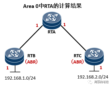 通过计算,RTA到达192.168.1.0/24下一跳是RTB,开销是2(RTA至RTB的开销值1+Type3 LSA的开销值1);RTA到达192.168.2.0/24下一跳是RTC,开销是2(RTA至RTC的开销值1+Type3 LSA的开销值1)。