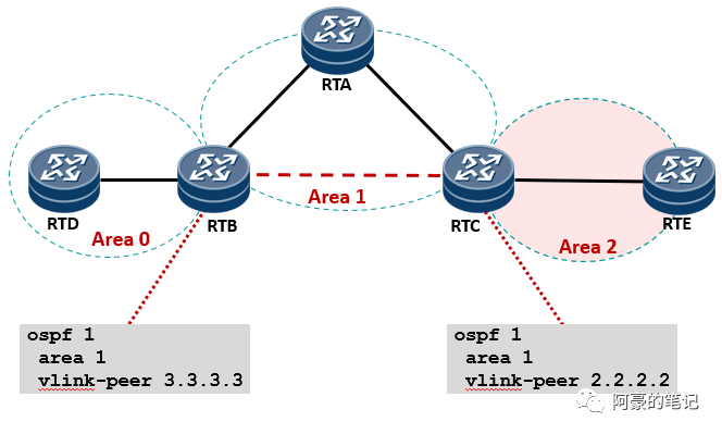 如下图所示,在RTB和RTC之间建立一条穿越Area1的Virtual Link,如此一来,RTC就可以通过这条Virtual Link与骨干区域相连,当然,Area2也就与骨干区域相连了,现在区域间的路由就可以由RTC来完成传递,Area2的孤岛问题也就解决了。