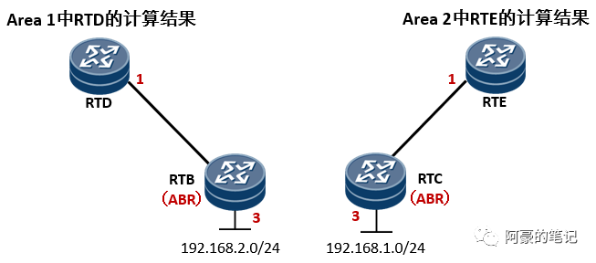 通过计算,RTD到达192.168.2.0/24下一跳是RTB,开销是4(RTD至RTB的开销值1+Type3 LSA的开销值3);RTE到达192.168.1.0/24下一跳是RTC,开销是4(RTE至RTC的开销值1+Type3 LSA的开销值3)。