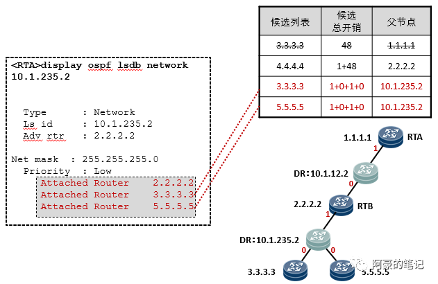 将候选总开销最小的节点3.3.3.3和5.5.5.5加入最短路径树并从候选列表中删除。此时继续检查Ls id分别为3.3.3.3和5.5.5.5的Router-LSA。