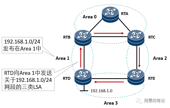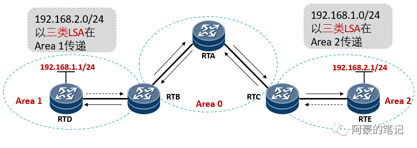 如下图所示,以Area 1中RTD上的192.168.1.0/24的网络为例,其对应的一类LSA在Area 1中同步;作为Area 1和Area 0之间ABR的RTB负责将192.168.1.0/24的一类LSA转换成三类LSA并将此三类LSA发送到Area 0。同理,RTC也会将192.168.2.0/24的三类LSA发布到Area0。
