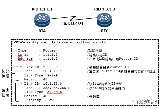 节点3.3.3.3(RTC)的Router LSA中,共1个Stub连接,网络号/掩码10.1.13.0/24,已在RTA上,忽略;