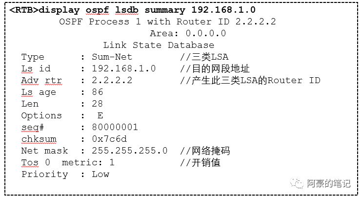 Area 0中RTA收到192.168.1.0/24和192.168.2.0/24的三类LSA中,Adv rtr分别是RTB(2.2.2.2)和RTC(3.3.3.3)。其中RTB产生的三类LSA中,网络号/掩码是192.168.1.0/24,开销为1,RTC产生的三类LSA中,网络号/掩码是192.168.2.0/24,开销为1。